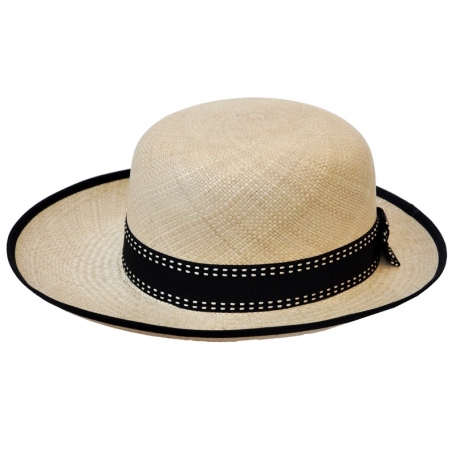 Queen, beige color, black stitched ribbon. A luxurious hat, handmade in Montecristi, the worldwide famous Panama Hat made in Ecuador. Each hat is individually blocked and trimmed to meet the highest quality standards.